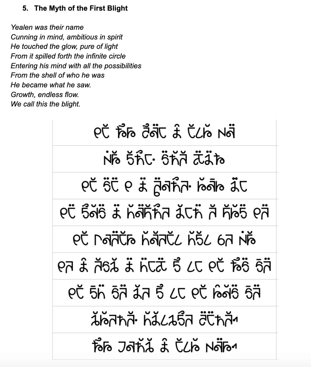 The first two phrases are done by myself and Vince, the translation portion is done by our master conlanger Jamin, and then those documents are then passed to artist Vinse for the final three phases. And then it’s of course up to me and Vince to facilitate everything in our role as editor/producer of the project.