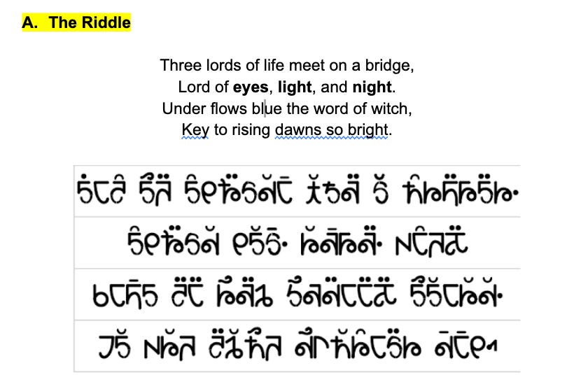 The hardest part was the riddle itself. This went through multiple iterations, but the key was to create a central riddle that would be solved from the various other writings on the wall. To facilitate this, I keyed in on a couple of key phrases: Eyes, Light, and Night. These would be the clues for the word to unlock the cypher.