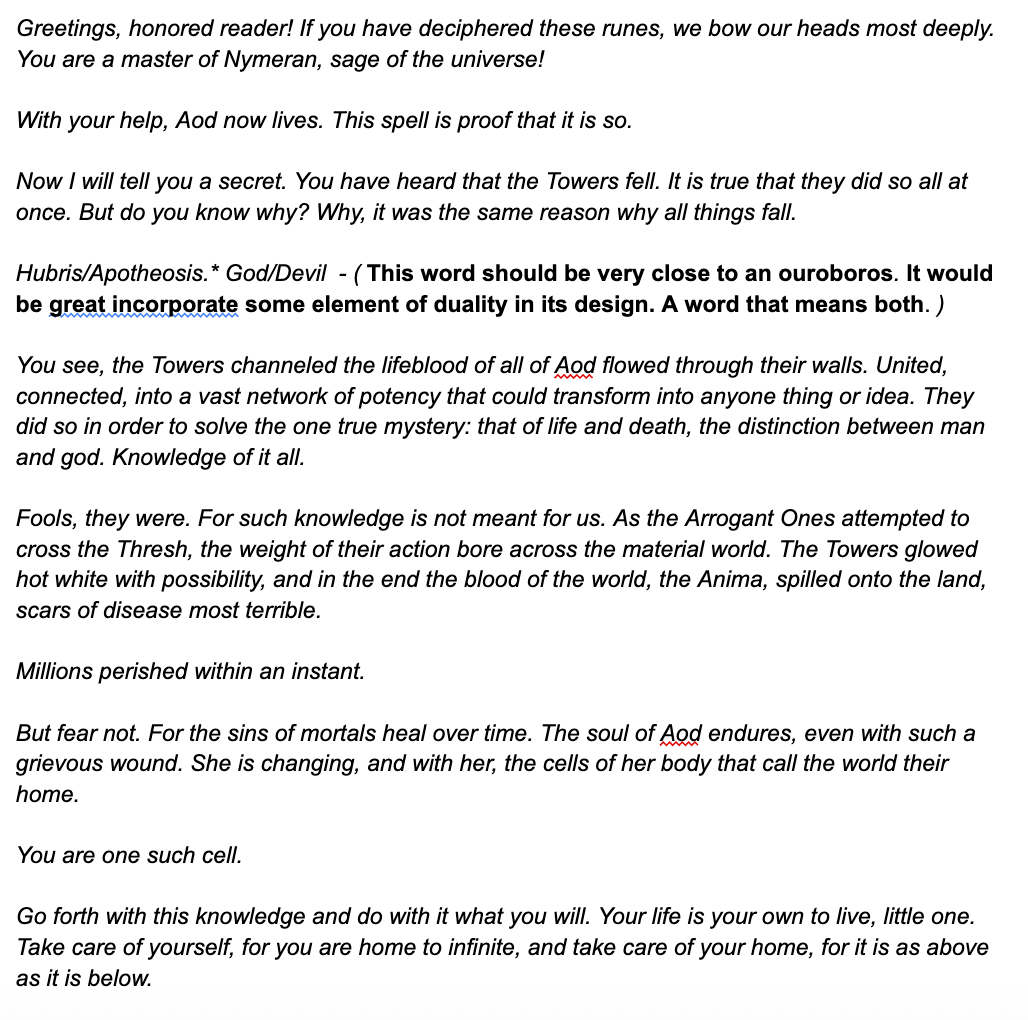 Above the Rune Dial and the Riddle sits the various Poems - various pieces of mythology from Ancient Nym. We had a couple of things, like the tale of Kaelun the Lightbringer and Chantress Eaya the Divine Feminine, and those certainly made it onto the wall (some as the actual clues to the riddle), but it’s a big wall that needs to be filled up…
